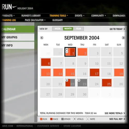 The 2004 redesign of NikeRunning.com was a large scale project that was a success by all metrics. Some of the new features included: a significant evolution of its training log application, the introduction of new shopping tools in a redesigned product wall, and richer, redesigned product detail pages.